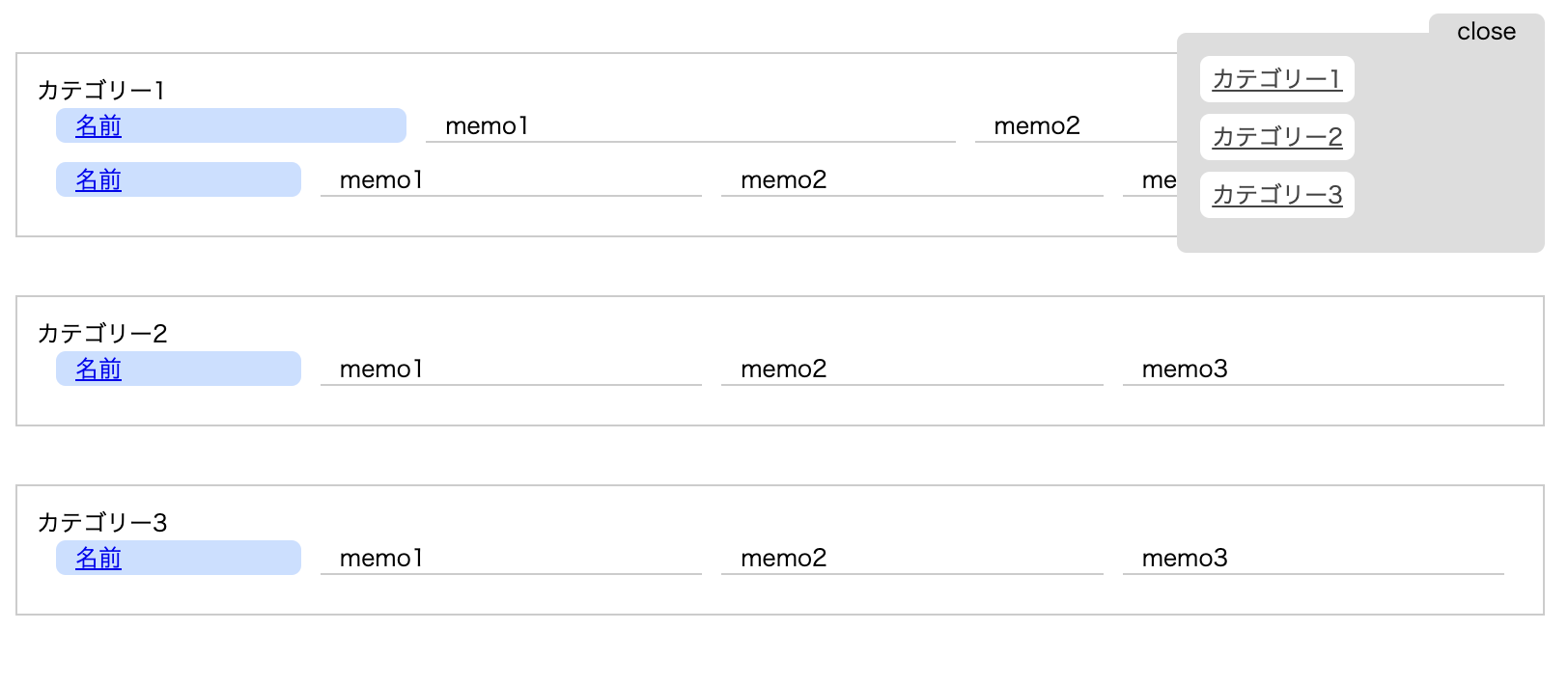 機能は名前とリンクとメモエリアが3つ、カテゴリー分けができるようになっています。