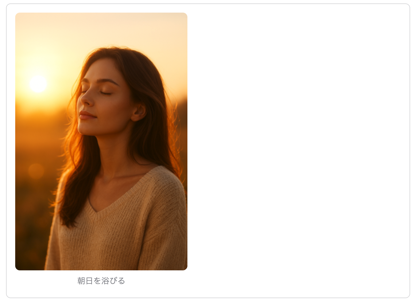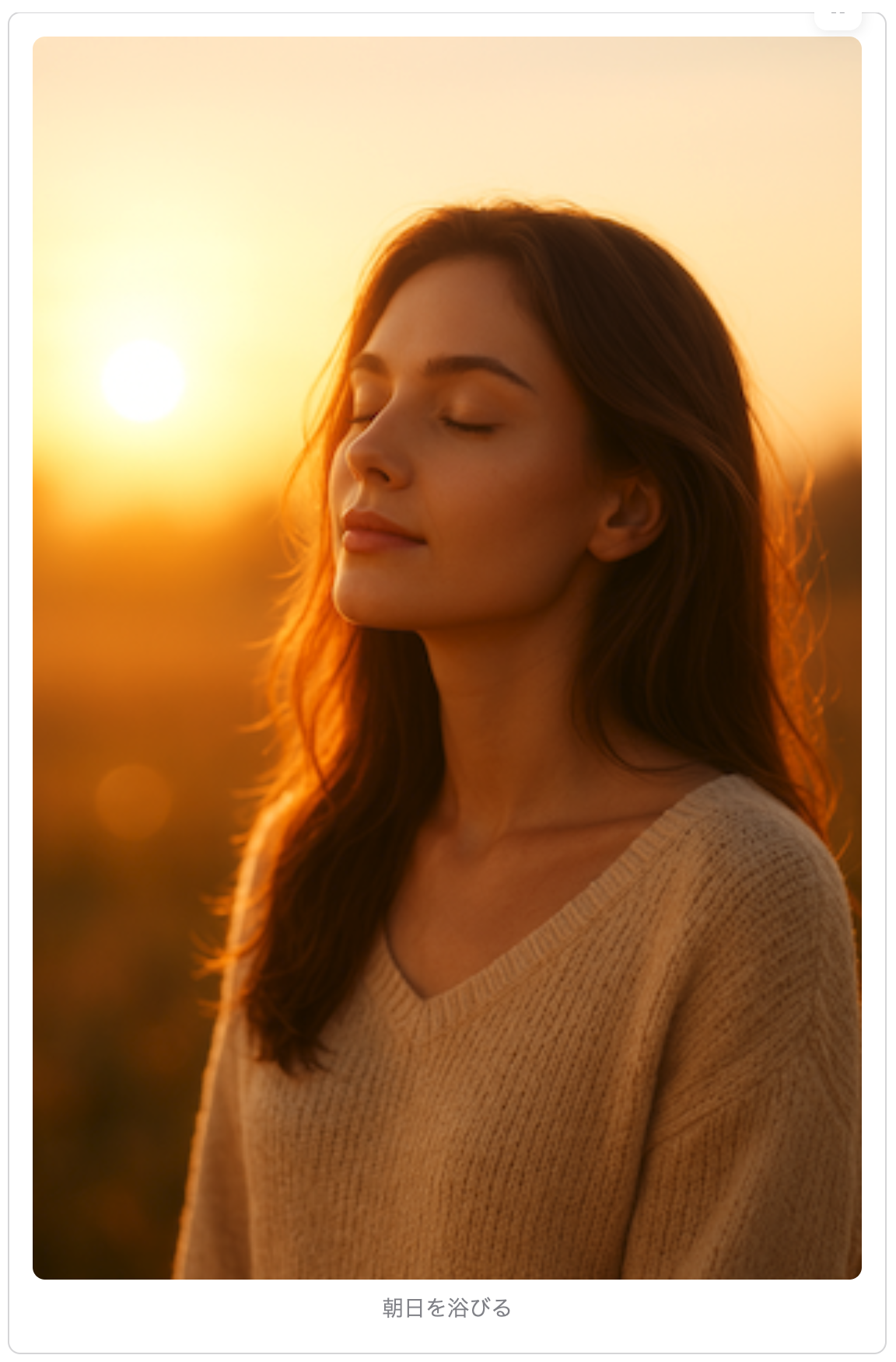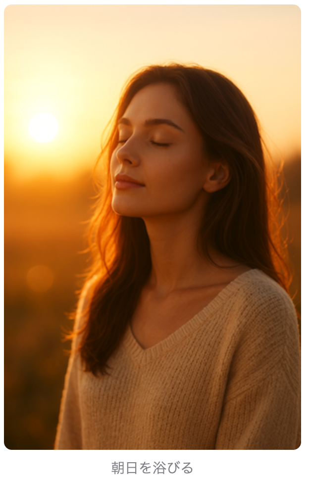 st.image("media/image/sunshain300.png", caption="朝日を浴びる",width="stretch")
