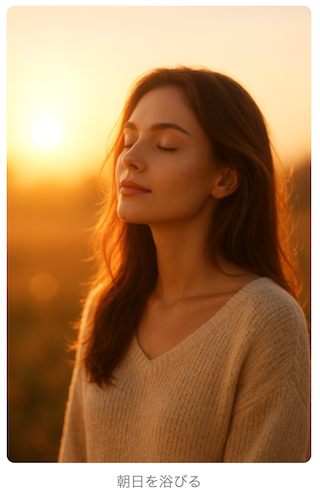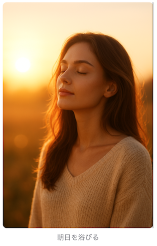 st.image("media/image/sunshain300.png", caption="朝日を浴びる",width="stretch")