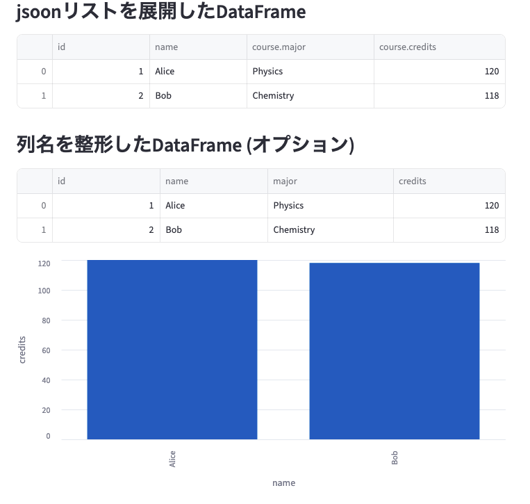 JSONファイルを参照して、表組(データフレーム)、グラフを描画するサンプルです。