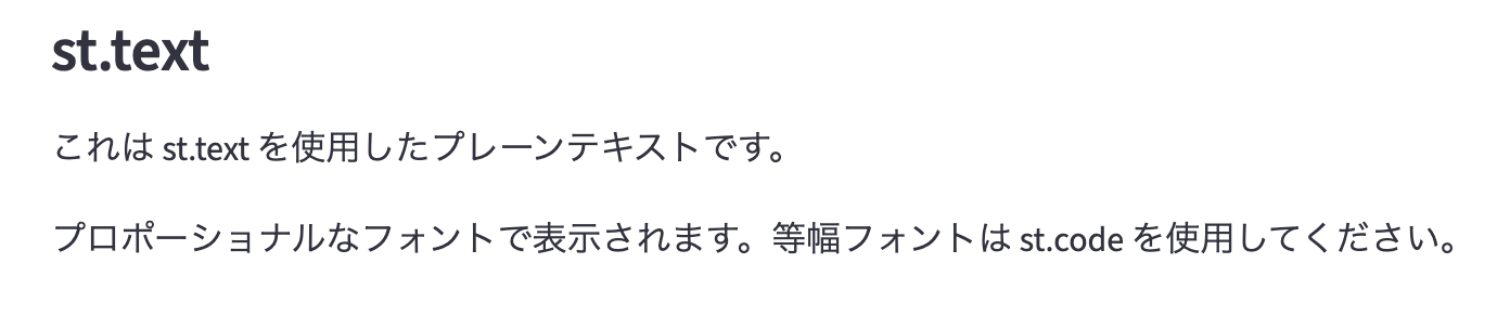 st.text("プロポーショナルなフォントで表示されます。等幅フォントは st.code を使用してください。")