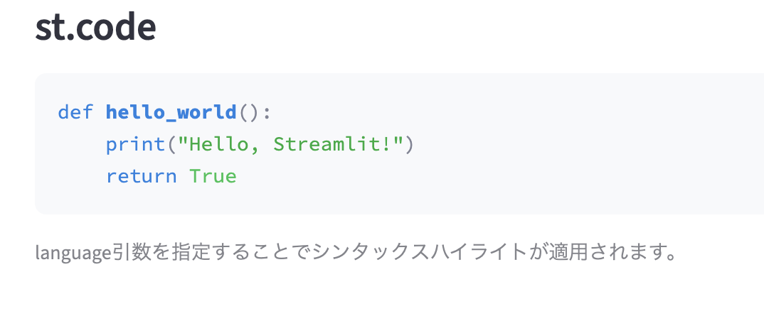 st.caption("language引数を指定することでシンタックスハイライトが適用されます。")