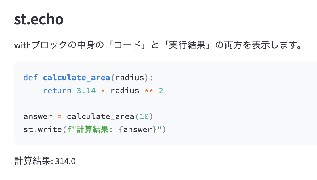 st.write("withブロックの中身の「コード」と「実行結果」の両方を表示します。")